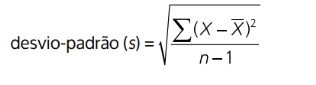Em palavras simples, o desvio- padrão representa o padrão de oscilações que os valores da série apresentam em relação à média. É frequentemente usado em conjunto com a média e, como essa, exige-se que as variáveis sejam do tipo numérica e é afetado por valores extremos. Para o cálculo do desvio-padrão, utiliza-se a seguinte fórmula: